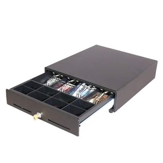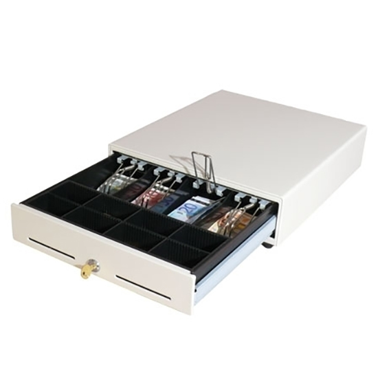 - Fächer: 4 verstellbare Geldscheinfächer mit Metallniederhaltebügel, 8 verstellbare Münzfächer, beide Fächer herausnehmbar, Auszug auf Kunststoffrollen